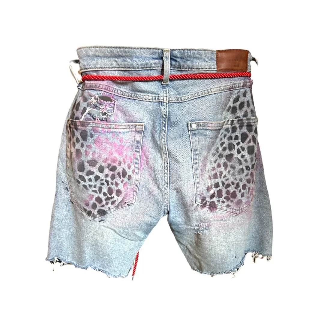 Hand painted denim shorts layer on top of layer designed , hand distressed adorne with a rope belt.